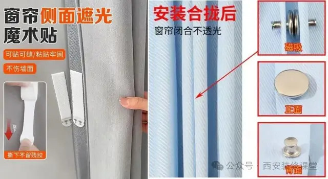 第十,两边没有墙体遮挡漏光,最简单就是采用魔力扣或者磁吸扣,一边粘墙上,另一边沾到窗帘上,就可以解决。