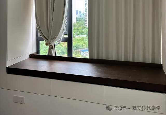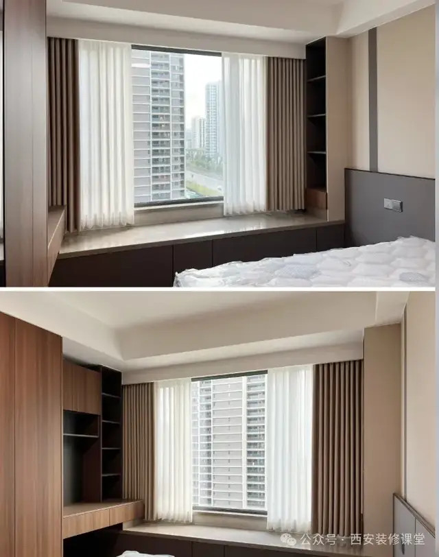 即使两边做收纳柜,必须留槽满足两边窗帘延伸,上方能做窗帘盒,保证不漏光。