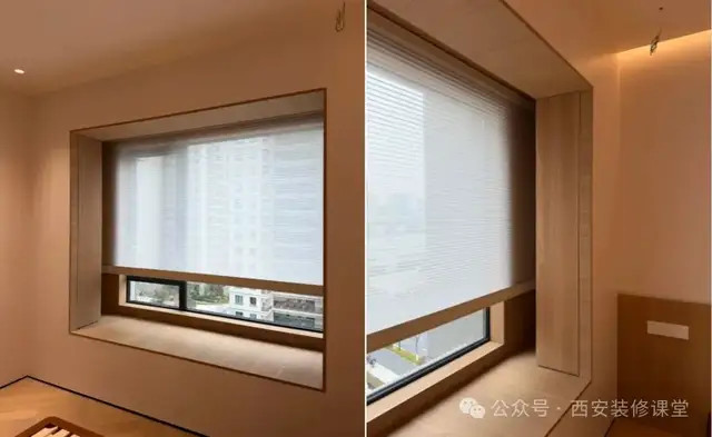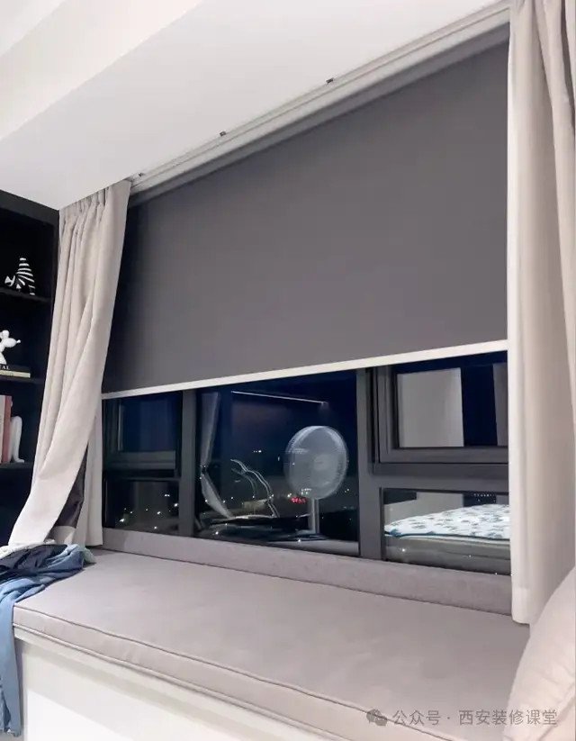 第九,如果是外开窗,窗帘盒太浅漏光,靠窗有条件直接加个遮光卷帘,可以彻底解决问题。