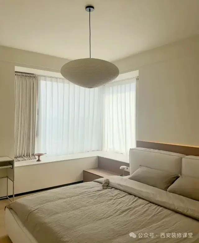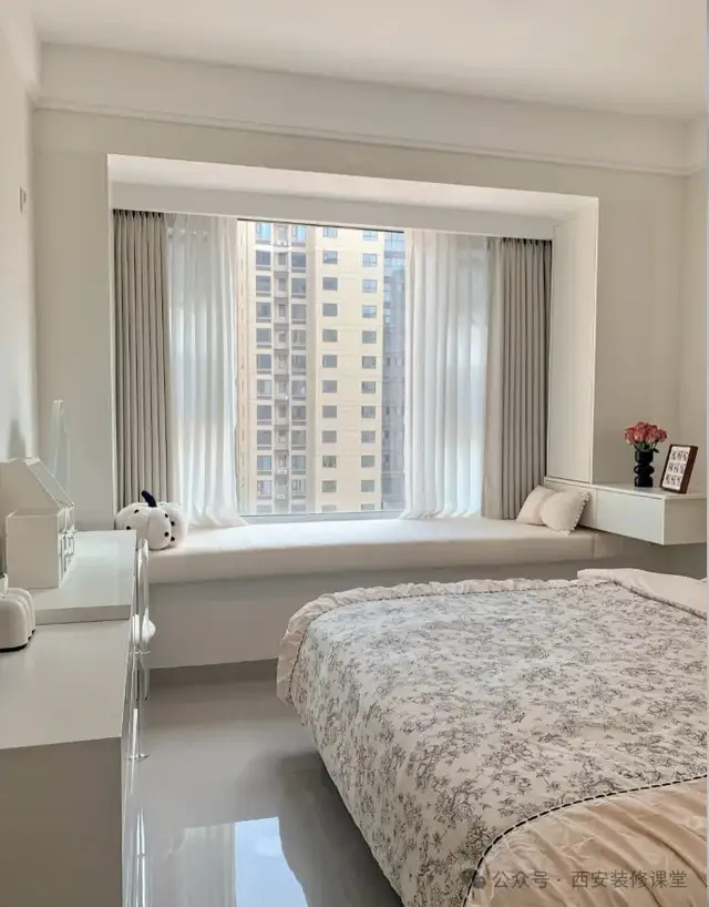 卧室小,利用了飘窗侧面柜收纳,同时延伸了床头柜,此时也无法实现落地满墙窗帘,只能退而求其次在窗户上做。
