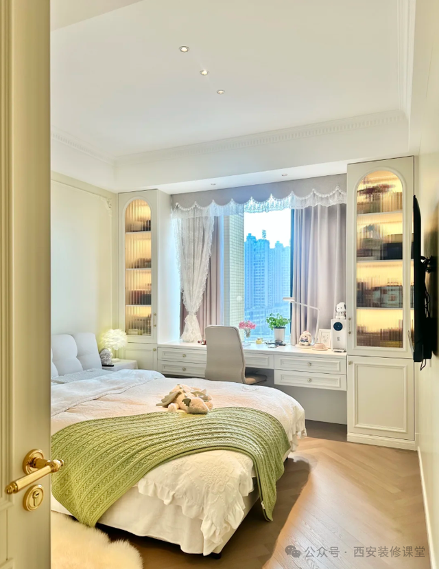 飘窗可以砸掉,为了满足收纳做了书桌/化妆台以及收纳柜,此时同样没有办法实现落地的窗帘,只能做到窗户上。