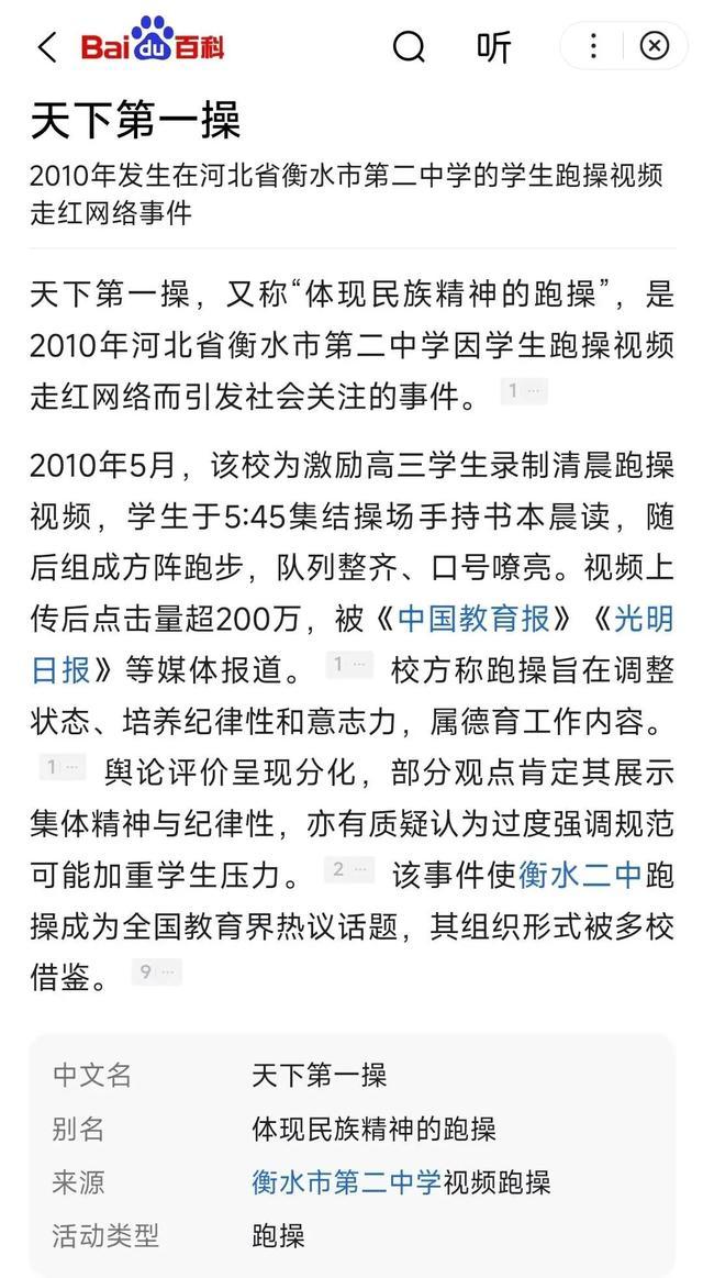 衡水模式最标志性的产物,就是被无数学校效仿的“天下第一操”。就是那种前胸贴后背的密集队列,迈着整齐划一的小碎步,喊着震耳欲聋的口号,一旦有一个人出错,就会被整个队伍拖累的跑操模式。这种跑操模式,从诞生的第一天起,就不是为了锻炼身体,而是为了两个字:表演。