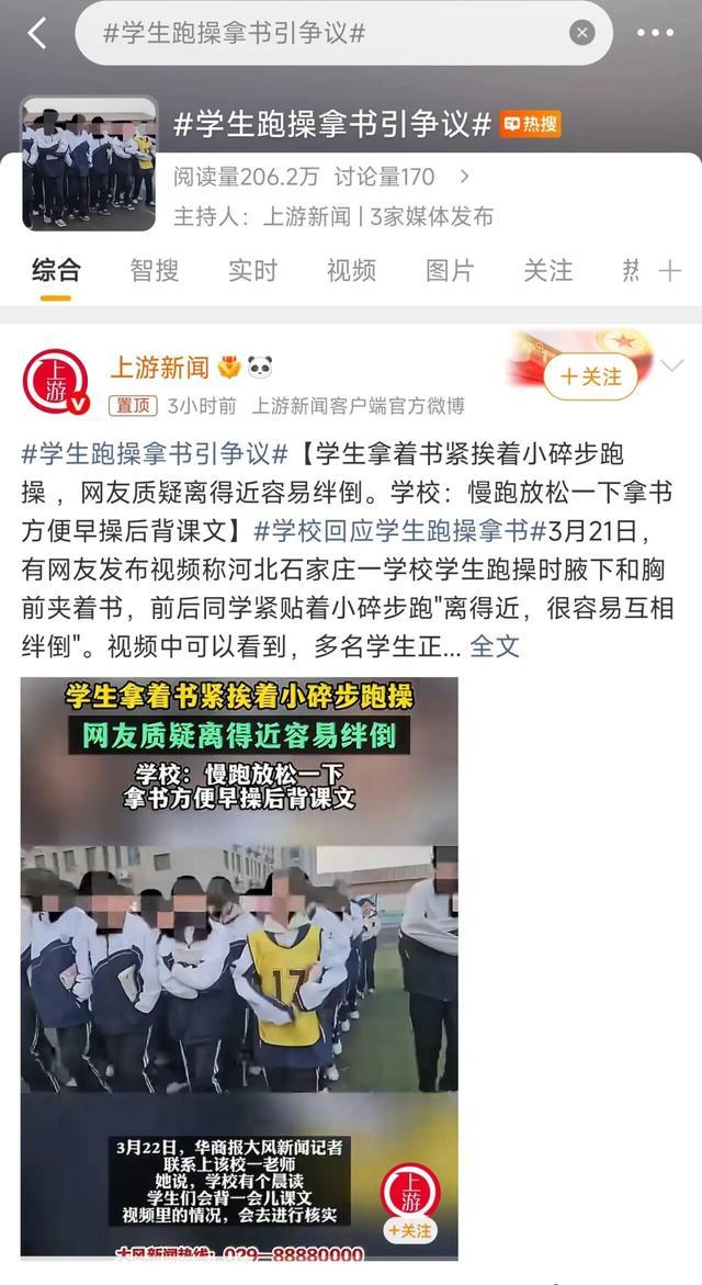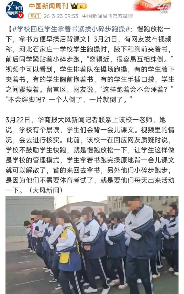 也就是说,学生怀里抱着的那本书,从跑操开始到结束,除了当个“刻苦学习”的道具,没有任何实际的学习价值。它唯一的作用,就是让管理者拍出来的视频更好看,让家长觉得“这学校管得真严,孩子连跑步都在学习”。