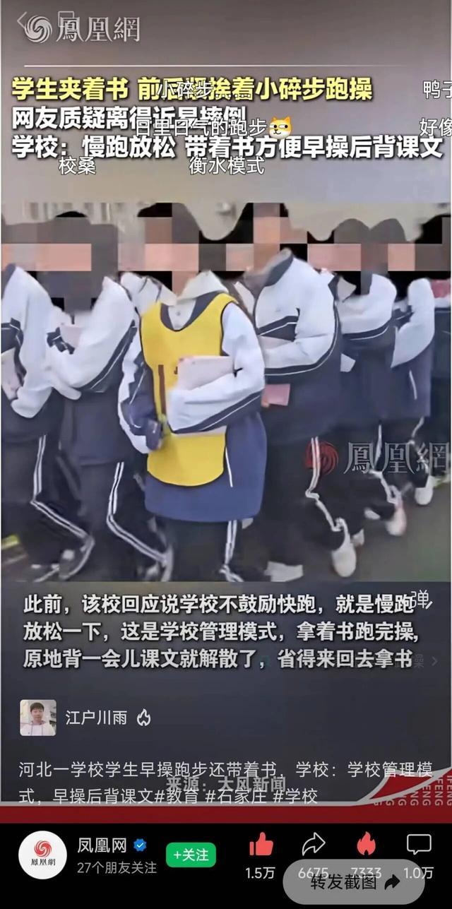 而面对网友的质疑,这个学校的工作人员理直气壮大言不惭的说:学校不鼓励学生快跑,就是慢跑放松一下,让学生这样做是学校的管理模式,学生拿着书跑完操,原地背一会儿课文就可以解散了,省的来回去拿书。