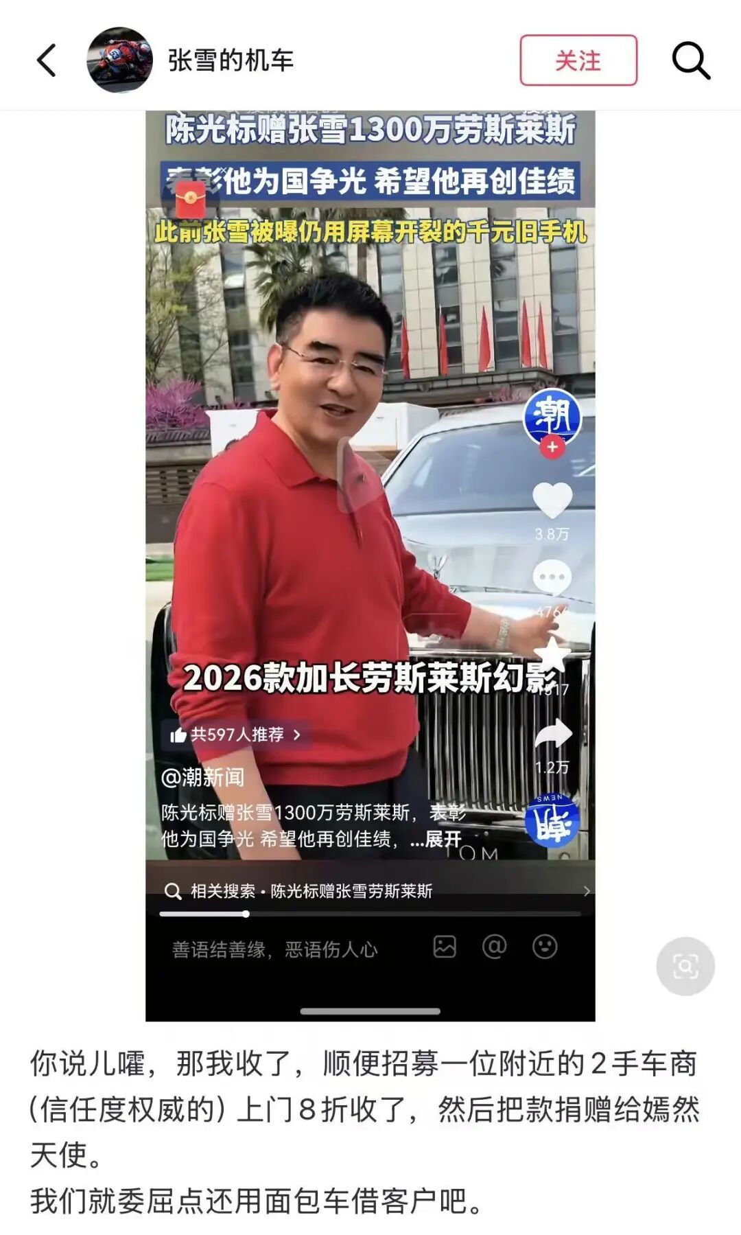 标哥决定将公司刚刚购买了一部,中国唯一一辆2026款加长劳斯莱斯幻影,市场价1300万赠予给你,作为张雪老弟的接待用车。张雪,你是中国的英雄,期待你再创佳绩,让中国制造闪耀世界。”